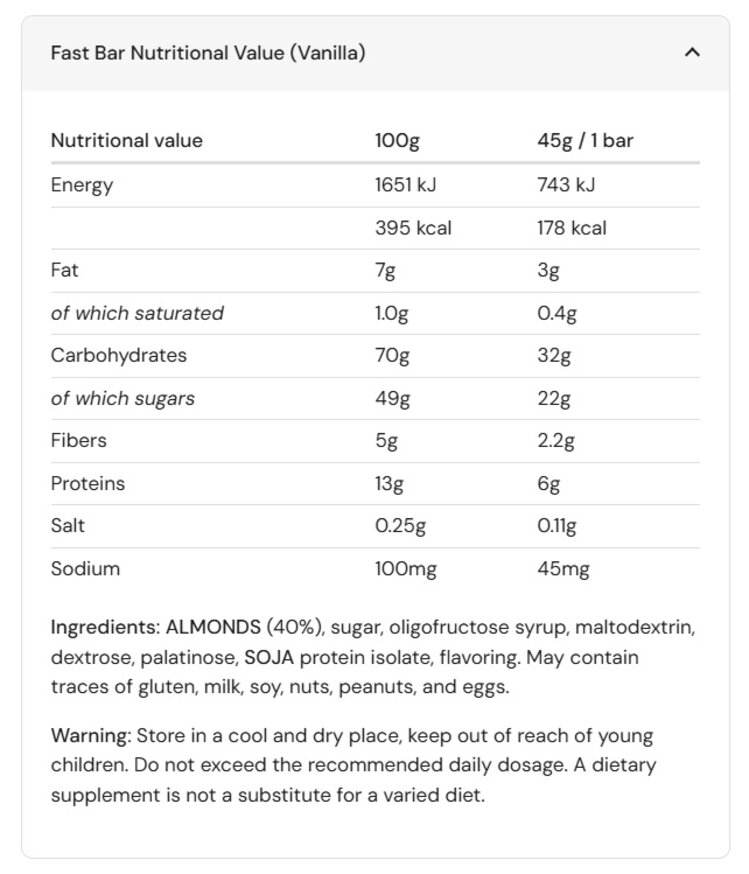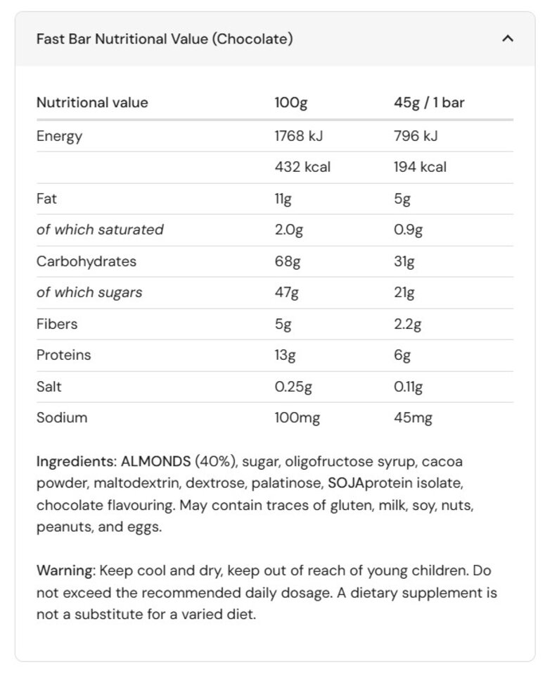 The Amacx Fast Bar Chocolate is a source of various types of carbohydrates that provide the right support (2:1 carbohydrate ratio). Thanks to its soft texture, this bar is easy to consume, making it ideal for use during sports. The bar consists of 40% almonds and is naturally rich in magnesium, potassium, and calcium. Available in Lemon, Chocolate and Vanilla flavors.