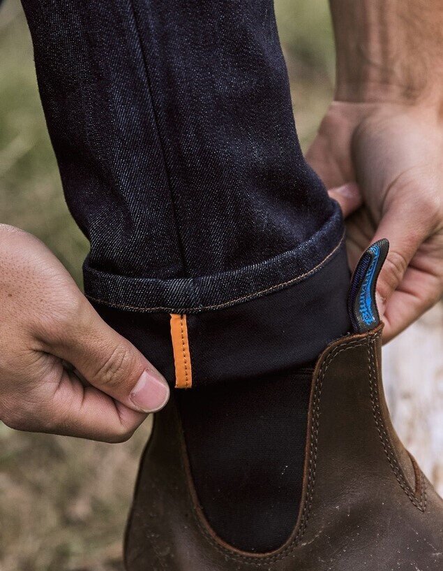 Mid-rise with a slim fit through the hip, and slight taper at the hem. Classic looking denim with the integration of stretch, our signature gusset, and performance fibres for all day comfort and style. The All-Weather features a wind and waterproof membrane softshell for warmth when temperatures swing.